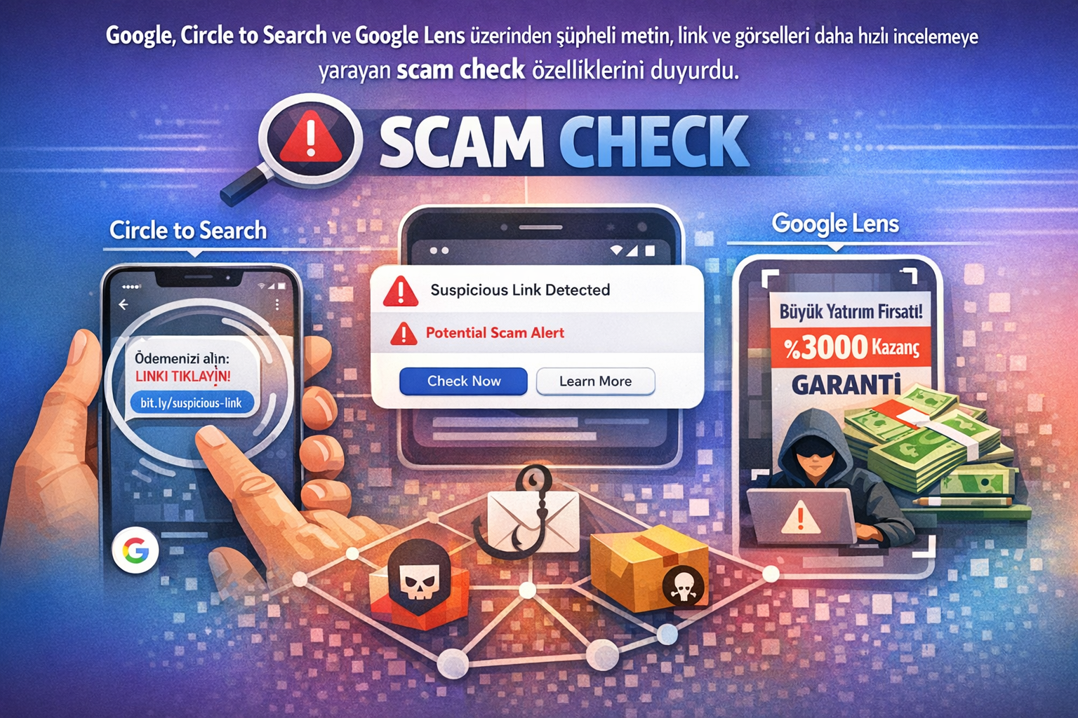 Circle to Search tarafında kullanıcı, Android cihazda ana ekran tuşuna ya da gezinme çubuğuna uzun basıp şüpheli metni daire içine alabiliyor. Google Lens tarafında ise şüpheli mesajın veya görsel içeriğin ekran görüntüsü alınarak Google uygulaması içinden Lens ile tarama yapılabiliyor. Google’ın yardım sayfası, bu sürecin ekrandaki metin ve görselleri dolandırıcılık işaretleri açısından inceleyebildiğini belirtiyor; bu da bağlantı içeren mesaj ekran görüntülerinin daha hızlı kontrol edilmesini destekleyebiliyor.