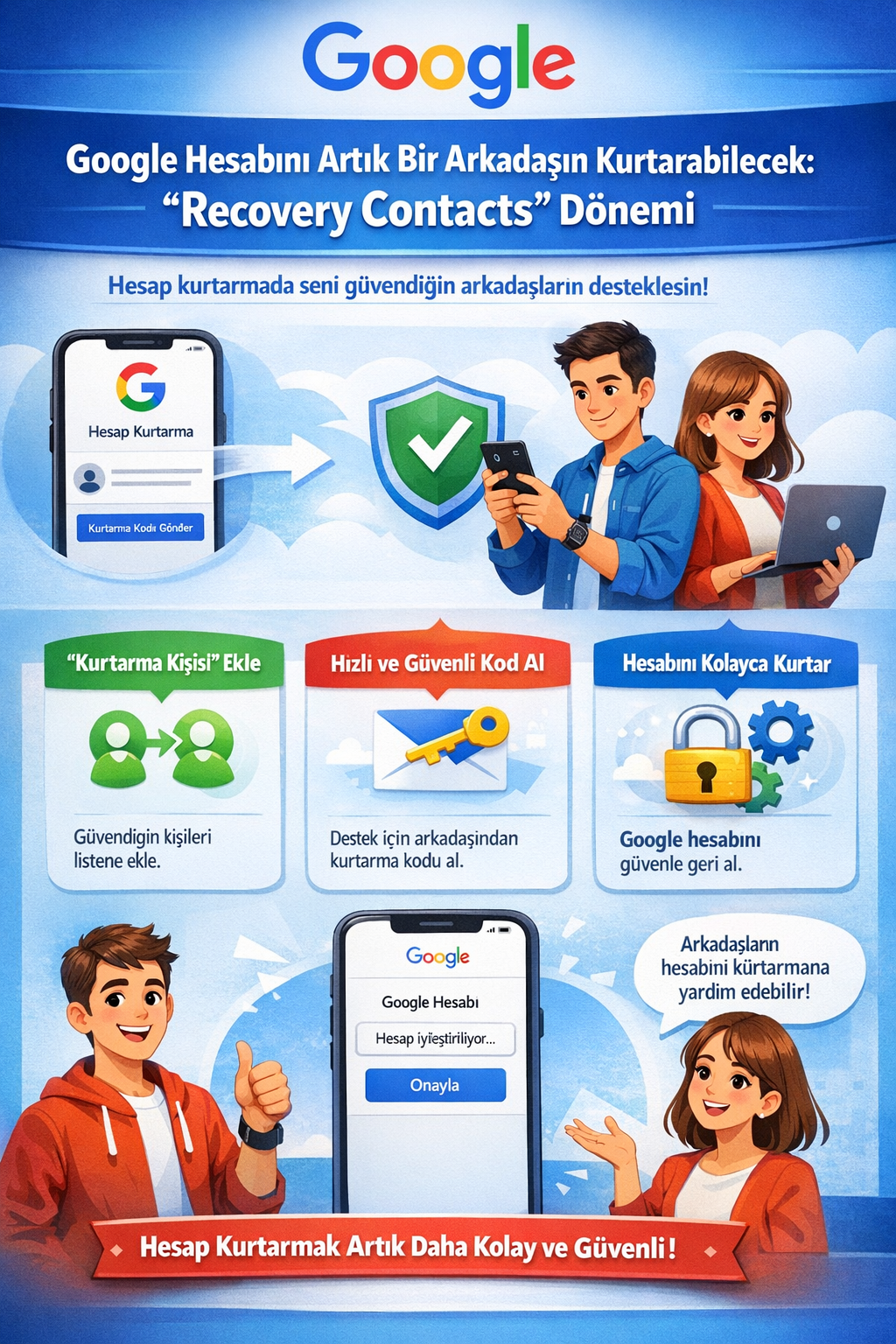 Bu sistemde kullanıcı, aile üyesi ya da yakın arkadaş gibi güvendiği kişileri önceden hesabına ekliyor. Google’ın yardım sayfalarına göre bir hesapta en fazla 10 kurtarma kişisi bulunabiliyor. Bu kişiler hesabın içine erişemiyor, güvenlik bildirimlerini yönetemiyor ve kişisel verilere ulaşamıyor; yalnızca kimlik doğrulama adımında destek veriyor.