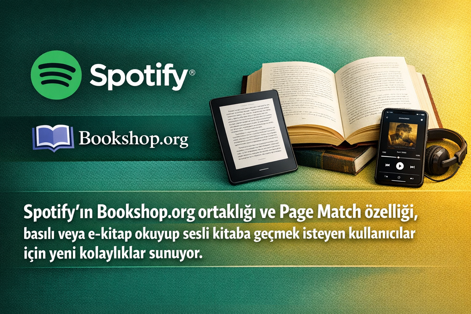 Spotify, 5 Şubat 2026’da duyurduğu iki yenilikle kitap deneyimini tek formatla sınırlamayan bir yapı kurmaya başladı. Şirket, Bookshop.org ortaklığıyla kullanıcıların Spotify uygulaması içinden basılı kitap satın alabilmesini hedeflerken, Page Match ile de basılı kitap veya e-kitap ile sesli kitap arasında daha akıcı geçiş sunuyor. İlk aşamada fiziksel kitap satın alma seçeneğinin ABD ve Birleşik Krallık’ta, ilkbaharın ilerleyen dönemlerinde devreye girmesi planlanıyor.