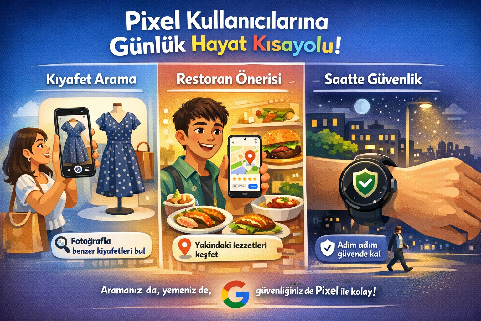 Google’ın Mart 2026 Pixel Drop güncellemesi, Pixel kullanıcılarına günlük hayatta işe yarayan üç pratik yenilik getiriyor: ekrandaki kıyafetin parçalarını tek tek bulma, sohbet içinden restoran önerisi alma ve saati kullanarak telefonu daha güvenli tutma. Resmi duyuruya göre Circle to Search artık bir kombini parçalayıp ürünleri ayrı ayrı arayabiliyor; Magic Cue ise mesajlaşma sırasında konuşmanın bağlamına göre Gemini ile restoran seçenekleri açabiliyor. Bağımsız teknoloji yayınları da bu özelliklerin dağıtıma çıktığını doğruluyor.